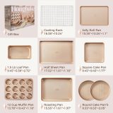 This comprehensive set includes essential pieces for your baking adventures, such as a cookie sheet with rack, cake pan, roasting pan, muffin tin, and more, all in a luxurious gold finish. Whether you’re baking cookies, cakes, roasts, or muffins, this set has you covered.